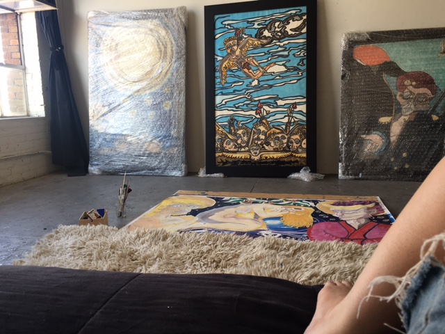 As fine artist, Victoria paints what she has coined, "Grotesque Cartoons." Her bold illustrative acrylic-ink paintings are composites of social critique, current affairs, and existential commentary. Bright color palates juxtaposed with salient black lines of thick ink on an over-sized tableau depict cautionary tales of personages lost or found.